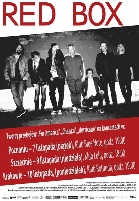 Red Box, brytyjska legenda muzyki znanej jako synth-pop, reaktywowana po 20 latach milczenia. Zesp zaoony w latach osiemdziesitych przez Simona Toulson Clarkea i Juliana Closea wystpi w listopadzie w trzech miastach.