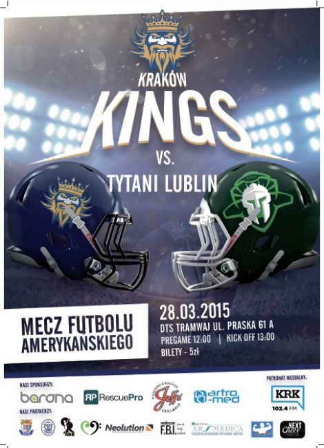 o godzinie 13:00 na stadionie DTS Tramwaj przy ul. Praskiej druyna Krakw Football Kings rozpoczyna swoje zmagania w Polskiej Lidze Futbolu Amerykaskiego. Jej rywalami