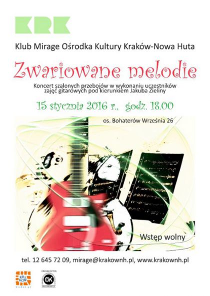 Uczestnicy zaj gitarowych w Klubie Mirage Orodka Kultury Krakw-Nowa Huta pod kierunkiem Pana Jakuba Zieliny przygotowali koncert szalonych utworw, ktrymi planuj zachwyci nawet najbardziej wymagajc publiczno. Serdecznie zapraszamy do Klubu Mirage (os. Bohaterw Wrzenia 26) 15 stycznia na godz. 18.00. Co moe by bardziej budujcego od dziecicej radoci pyncej z tworzonej i wykonywanej muzyki? Przyjdcie i przekonajcie si sami.