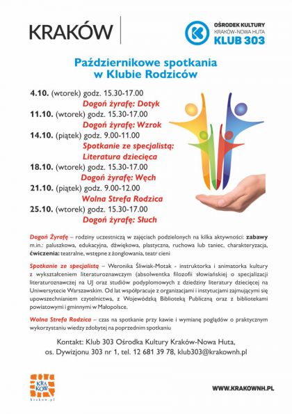 | Klub 303 Orodka Kultury Krakw-Nowa Huta (os. Dywizjonu 303 nr 1) serdecznie zaprasza na kolejne spotkanie Klubu Rodzicw, ktrego gociem bdzie Weronika liwiak-Motak instruktorka i animatorka kultury z wyksztaceniem literaturoznawczym. Spotkanie odbdzie si 14 padziernika o godz. 9:00. Prowadzca jest absolwentk filologii sowiaskiej o specjalizacji literaturoznawczej na UJ oraz studiw podyplomowych z dziedziny literatury dziecicej n(...) ... więcej » |