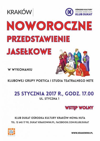 Klub Dukat Orodka Kultury Krakw-Nowa Huta (ul. Styczna 1) zaprasza wszystkich mieszkacw Grbaowa i okolicznych osiedli na midzypokoleniowy spektakl w wykonaniu Klubowej Grupy Poetica oraz Studia Teatralnego NETE. 25 stycznia o godz. 17.00 na scenie przybliona zostanie historia Boego Narodzenia z przymrueniem oka - przedstawienie nawizuje do tradycji jasekowej. Po przedstawieniu aktorzy opowiedz uczestnikom (szczeglnie dzieciom) o tym(...)  ... więcej »