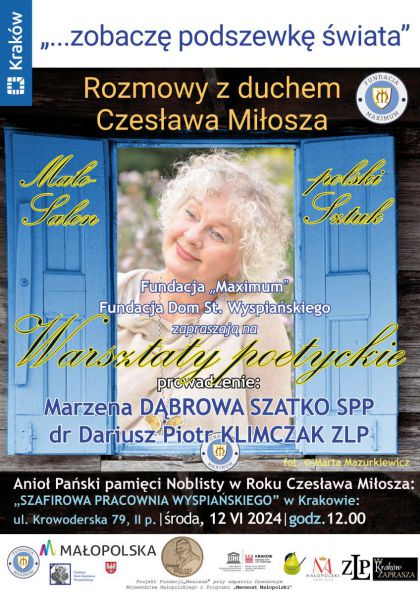W ramach obchodów "Roku Czesława Miłosza" Fundacja "Maximum" oraz Fundacja Dom Stanisława Wyspiańskiego zapraszają na spotkanie i warsztaty poetyckie poświęcone Nobliście pn. „zobaczę podszewkę świata”. Rozmowy z duchem Czesława Miłosza 12 czerwca 2024 r. w Szafirowej Pracowni Wyspiańskiego w Krakowie, przy ul. Krowoderskiej 79, o godz. 12.00.