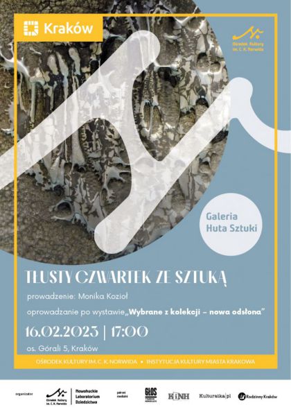 Galeria będzie otwarta dla widzów od godziny 11 do godziny 19. Wstęp na wystawę będzie bezpłatny, dodatkowo dla zwiedzających będą czekać pączki, które łagodnie wprowadzą w nastrój tłustego czwartku. W programie, oprócz tradycyjnych słodkości, znajdzie się także oprowadzanie po wystawie, poprowadzone przez historyczkę sztuki Monikę Kozioł, które odbędzie się o godz. 18. Będzie to okazją do zapoznania się z nową odsłoną wystawy w Galerii Huta Sztuki, która bazuje na zbiorach Ośrodka Kultury im. C. K. Norwida. Uczestnicy poznają historię kolekcji, najważniejsze prace oraz ich autorki i autorów. Przede wszystkim jednak wydarzenie będzie pretekstem do ukazania Nowej Huty jako dzielnicy artystów.