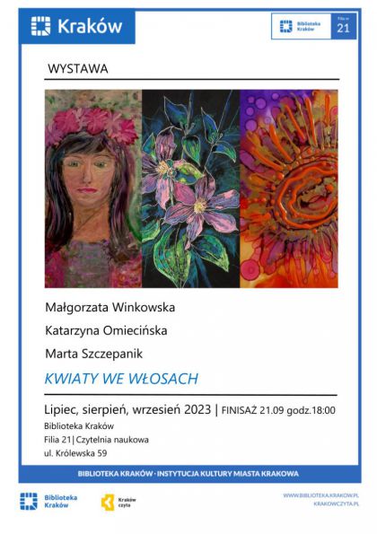 Malarki zapraszają serdecznie do Czytelni Naukowej, ul. Królewska 59, na kolejną wspólną wystawę – „Kwiaty we włosach” od 1.07.2023 – 30.09.2023 oraz na finisaż wystawy 21.09.2023r.