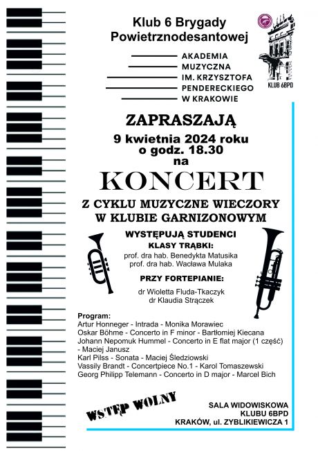 09 kwietnia br., o godz. 18.30 odbędzie się koncert z cyklu: "Muzyczne Wieczory w Klubie Garnizonowym", organizowany wspólnie z Akademią Muzyczną im. Krzysztofa Pendereckiego w Krakowie.