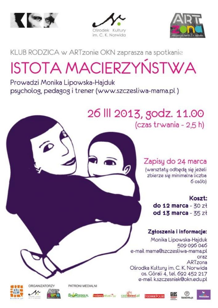 Natłok spraw do ogarnięcia, obowišzków, iloć ról, które przychodzi nam pełnić, może czasem przytłaczać. Jest też tak, że rozpędzone do granic możliwoci nie mamy czasu myleć o sobie, swoich potrzebach, ale w głębi serca czujemy, że co jest nie tak... Zastanawiamy się też czy dobrze opiekujemy się swoim dzieckiem? Czy co możemy robić lepiej, inaczej... Jaka jest nasza relacja z córkš lub synem? W głowie mamy może pojawiać się wiele wštpliwoci. Zapraszam Was wszystkie - wieżo upieczone mamy, te z większym stażem, w cišży, czy też planujšce dopiero wchodzenie w macierzyństwo.