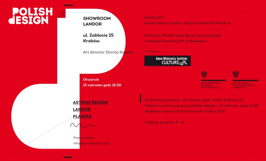 Serdecznie zapraszamy na wystawę POLISH DESIGN zaprezentowana w ramach Salone del Mobile 2013 w Mediolanie oraz inauguracje GALERII ŒCIANA jak i wiele innych wydarzeń w ramach festiwalu KRAKÓW DESIGN STREET który odbędzie się 15 czerwca w godzinach 12.00 do 22.00.