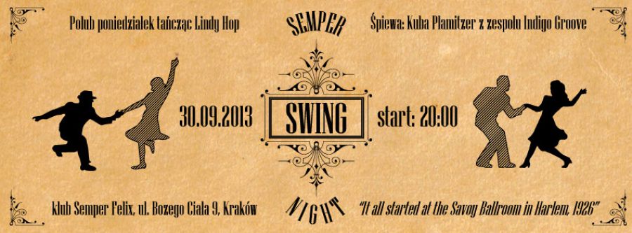 Zapraszam wszystkich, którzy w sercu majš tańce Złotej Ery Swingu, lubiš się bawić przy pięknej muzyce (zaœpiewa nam Jakub Plamitzer, póŸniej zabrzmi nowoorleański jazz) i majš ochotę polubić poniedziałki! Wczeœniejsze swingowe zabawy wyszły przednio, Kazimierz huczy o potańcówkach w Semper Felix, a przecież wszystkim nam zależy na tym, by równać w górę!