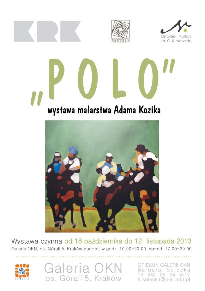 "Na obrazach z cyklu Polo Adama Kozika dostrzegamy pewne postacie, niemniej sš one z trudem rozpoznawalne. Geometryczne figury przechodzšc w barwne plamy zdajš się eksplodować i wirować w wietle , w którym możemy je przez chwilę oglšdać. Pewna niezwykła siła sprawia tutaj , że ciała koni i jedców rozpadajš się na na kawałki , jednakże to ta sama siła nie pozwala im rozpać się całkowicie i zginšć w chaosie . Inaczej mówišc choć nie zachowujš one znanej nam formy , w której wszystkie częci zostajš wyranie wyszczególnione , nie osišgajš również poziomu abstrakcji , w której rozpoznanie ich nie jest już możliwe. Tym samym malarstwo to oscyluje pomiędzy tym co nieokrelone, będšce efektem przemocy, a tym co figuratywne i przemylane. Pomiędzy strategiš gry i samš rozgrywkš, która zdaje się niezwykłym i niemożliwym do uchwycenia w pełni fenomenem. Poruszajšc się na krawędzi rozpoznawalnych form i nieujarzmionego przepływu materii, artysta stara się wydobyć siły oraz energie ukryte w rzeczach bez pogršżania ich w anarchii, czystym nieokiełznanym i niestabilnym życiu , w którym uległyby całkowitemu zatraceniu, a które pozostaje tutaj jedynie w sferze intuicji." Tekst: Jacek Romański