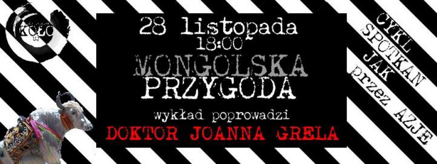 Już 28.11 zapraszamy na pierwsze spotkanie z cyklu "JAK przez AZJE" organizowane przez Koło Naukowe OKoło! Naszym goœciem będzie Joanna Grela, która podzieli się z nami swoimi doœwiadczeniami z wypraw do Mongolii - zarówno z punktu widzenia osoby studiujšcej, jak i podróżujšcej po kraju buddyzmu tybetańskiego. W trakcie krótkiego wykładu (nie mylić z tym na uczelni) postara się nie tylko przybliżyć nam efekty swojej pracy naukowej. Opowie także jak poznawała Mongolię, by pomóc nam w osišgnięciu celu cyklu - zdobywania wiedzy potrzebnej w wyprawie do Azji. W końcu kto z nas nie marzy o podróży na drugi koniec œwiata? A po wykładzie czas na pytania i dyskusję! Przygotujcie więc wszystkie nurtujšce Was od lat pytania zwišzane z Mongoliš. Czy w Ułan Bator parkuje się konie? Czy Mongołowie majš zasięg? Czy lama to więcej niż jedno zwierzę? Oto unikalna okazja byœcie rozwiali swoje wštpliwoœci.