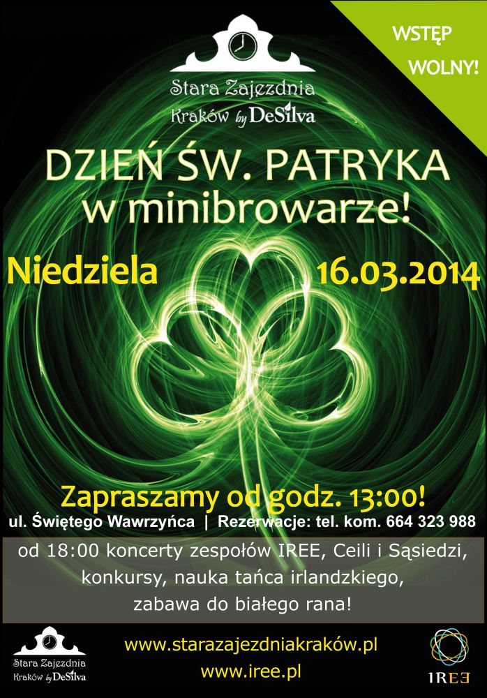 Organizatorzy ze Starej Zajezdni zapraszajš fanów kultury i muzyki irlandzkiej oraz wszystkich lubišcych dobrš zabawę. Przygotowano liczne konkursy, warsztaty tańca irlandzkiego, specjalne menu i zielone piwo. Nie zabraknie oczywiœcie również irlandzkiej whiskey. Lá Fhéile Pádraig Sona Daoibh!