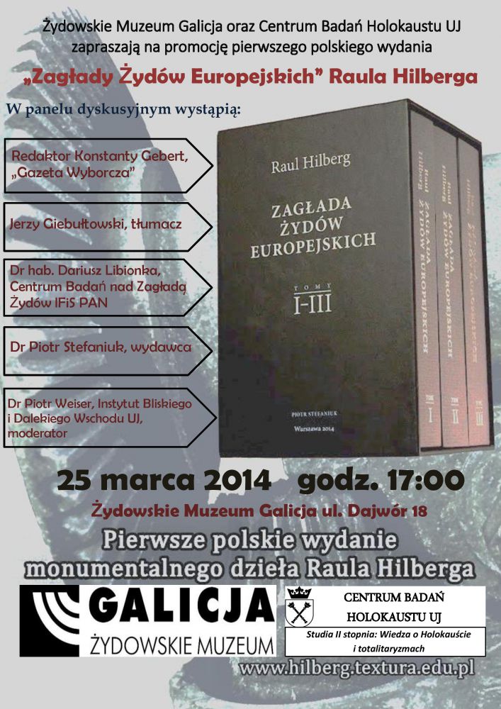 Krakowska premiera monografii Hilberga odbędzie się 25.03 o godzinie 17:00. W dyskusji udział wezmš: redaktor Konstanty Gebert, Jerzy Giebułtowski (tłumacz), dr Piotr Stefaniuk (wydawca)dr hab. Dariusz Libionka (Centrum badań nad Zagładš Żydów IFiS PAN) spotkanie moderował będzię dr Piotr Weiser z Instytutu Bliskiego i Dalekiego Wschodu UJ. Organizatorami spotkania sš Centrum Badań Holokaustu UJ oraz Żydowskie Muzeum Galicja.
