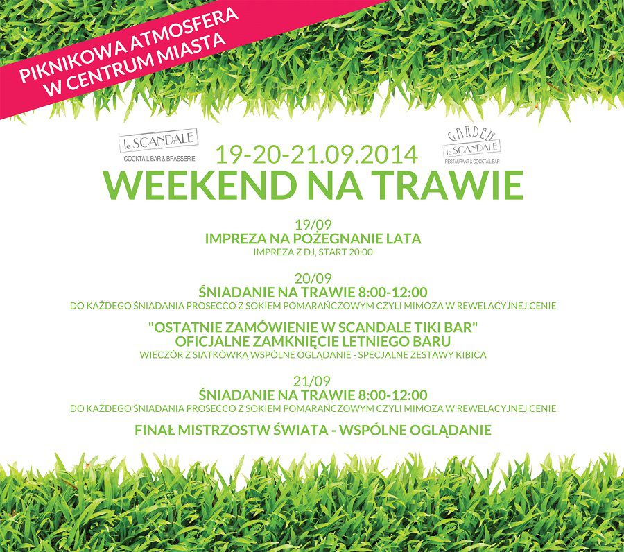 Mimo, że astronomiczne lato kończy się z dniem 23 wrzeœnia, to tak na prawdę dla wielu staje się to na poczštku miesišca, wraz z końcem wakacji i coraz krótszym dniem a dłuższš nocš. Aby nie zapominać o tej porze roku i przygotować się na "niepogodę" Le Scandale i Garden Le Scandale zapraszajš na WEEKEND NA TRAWIE, podczas którego podobnie jak w zeszłym roku wszystko się zazieleni za sprawš prawdziwej ... trawy!