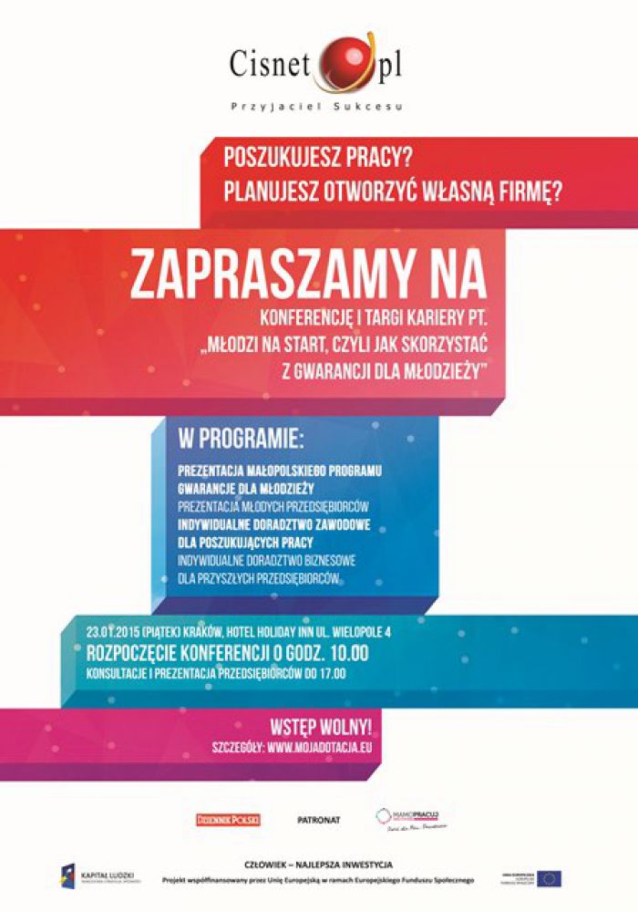 Celem przedsięwzięcia jest przedstawienie młodym mieszkańcom woj. małopolskiego w wieku od 15 do 29 lat, działań skierowanych do tej grupy wiekowej jakie będš realizowane w ramach programu Gwarancja dla Młodzieży w latach 2014-2020, jak również młodych ludzi, którzy nie chcšc pozostawać biernymi na rynku pracy, zdecydowali się na rozpoczęcie własnej działalnoci gospodarczej przy wsparciu dotacji unijnych.