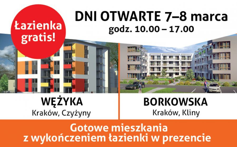 Już w ten weekend, 7-8 marca, nabywcy zainteresowani zakupem mieszkania, będš mogli zobaczyć, jak wyglšdajš energooszczędne inwestycje Wawel Service Borkowska B1 i B2 oraz Wężyka 10. Z okazji Dni Otwartych deweloper przygotował promocję przy rezerwacji mieszkania wykończenie i wyposażenie łazienki gratis.