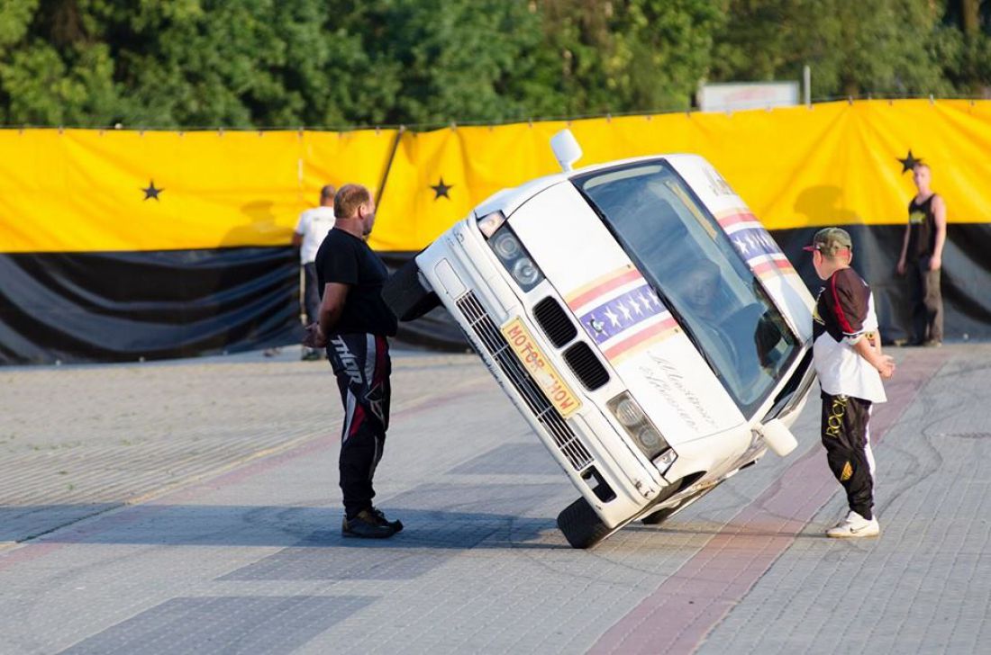 * kaskaderzy jeżdżšcy na bocznych kołach samochodów osobowych, quadów;