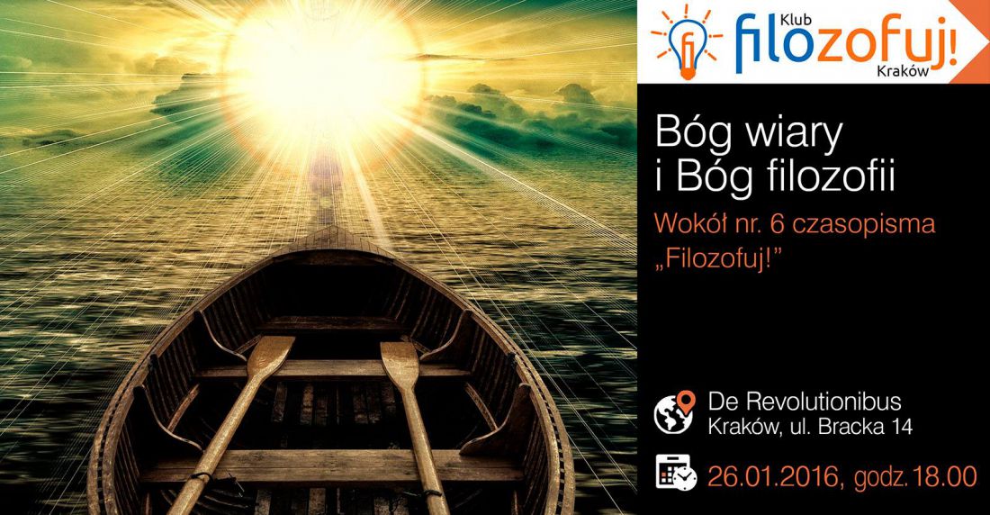 Po raz drugi zorganizowalimy dla Was spotkanie w Krakowie w ramach Klubu Filozofuj!. Tym razem tematem będzie: Bóg wiary i Bóg filozofii. Wokół nr. 6 Filozofuj!. Odbędzie się ono 26 stycznia 2016 o godz. 18 w De Revolutionibus. Books&Cafe przy ul. Brackiej 14 w Krakowie, gdzie można kupić drukowanš wersję magazynu. Goćmi specjalnymi spotkania będš: prof. Jan Woleński, dr hab. Piotr Bartula oraz dr Michał Bizoń. Zapraszamy mieszkańców Krakowa i okolic.