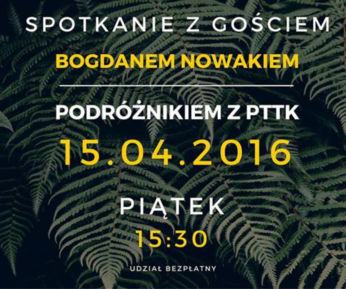 Tym razem odwiedzi nas Pan Bogdan Nowak - podróżnik, przewodnik PTTK, znawca turystyki górskiej. Goœć podzieli się swoimi doœwiadczeniami zdobytymi podczas podróży m.in. do Peru i na Syberię. Nie zabraknie prezentacji zdjęć z wypraw i czasu na pytania specjalne.