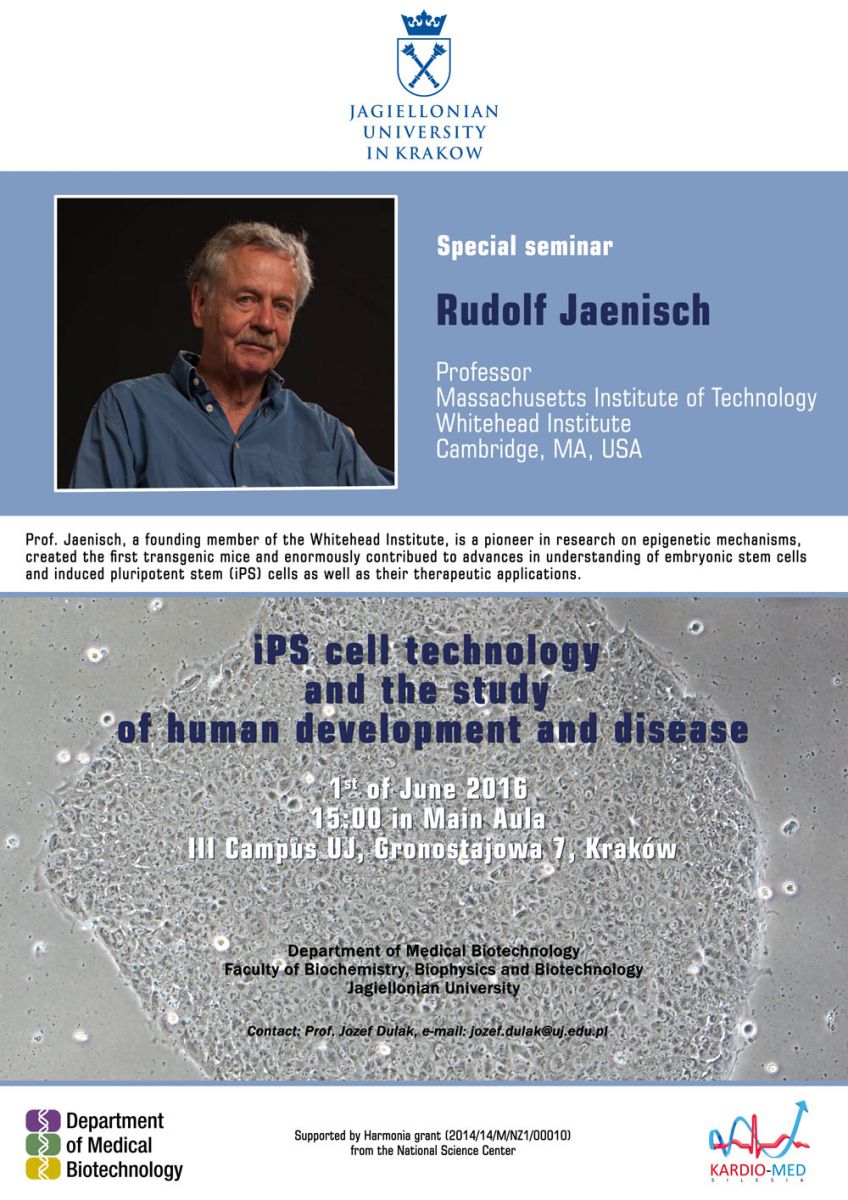 1 czerwca 2016 r. o godz. 15:00 w auli Kompleksu Dydaktyczno-Bibliotecznego przy ul. Gronostajowej 7 w Krakowie, odbędzie się wykład prof. Rudolfa Jaenischa pt. iPS cell technology and the study of human development and disease". Prof. Jaenisch, członek-założyciel Whitehead Institute (Cambridge, USA), członek Amerykańskiej Akademii Nauk, laureat licznych prestiżowych nagród naukowych, jest pionierem w badaniach nad mechanizmami epigenetycznymi. Jako pierwszy uzyskał transgeniczne myszy, w olbrzymim stopniu przyczynił się do postępu w badaniach nad zarodkowymi komórkami macierzystymi oraz indukowanymi pluripotencjalnymi komórkami macierzystymi (iPS; induced pluripotent stem cells), wskazujšc zarazem na ich przyszłe zastosowanie terapeutyczne.