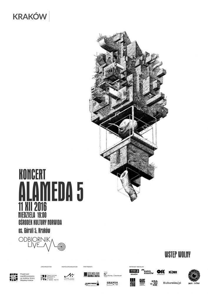 Kwintet Alameda to młodszy brat Alameda Trio (skład znany z dobrze przyjętego albumu "Póne królestwo", 2013). Grupa Alameda 5 jest mniej zakochana w muzyce rockowej, bardziej ceni sobie improwizację i eksperyment, a jednoczenie cechuje jš upodobanie do transowych, wręcz tropikalnych rytmów. Rytmiczne fundamenty stanowiš tu perkusista Jacek Buhl (Jachna/Buhl, Trzy Tony, Glabulator, ex-Variete, ex-Trytony) i perkusjonista Rafał Iwański (HATI, X-Navi:Et, Innercity Ensemble, Kapital). Tonalny trzon kwintetu, podobnie jak w Alameda 3, stanowiš gitarzyci Mikołaj Zieliński (T'ien Lai, Rara) oraz Kuba Ziołek (Stara Rzeka, Innercity Ensemble, Kapital, Ed Wood, T'ien Lai). Skład uzupełnia obsługujšcy instrumenty elektroniczne oraz syntezatory Łukasz Jędrzejczak (T'ien Lai, So Slow, Duży Jack). Podwójny album "Duch tornada" (Instant Classic, maj 2015, CD; siepień 2016, winyl) zebrał garć entuzjastycznych recenzji, był wysoko notowany w wielu rocznych zestawieniach. Zespół Alameda 5 od pierwszego koncertu na Unsound Festival w Krakowie (2014) zagrał szereg koncertów w klubach oraz festiwalach jak m.in. na Avant Art Festival, Mózg Festival, Green ZOO Festival, PiotrkOff Art Festival, Festiwal Mięty Pole, za każdym razem spotykajšc się z entuzjastycznym przyjęciem ze strony publicznoci. Od grudnia 2016 Jacka Buhla zastępuje (ze względu na chorobę i rekonwalescencję) Tomek Popowski - znany m.in. z zespołów Innercity Ensemble, Ed Wood i Alameda 3.