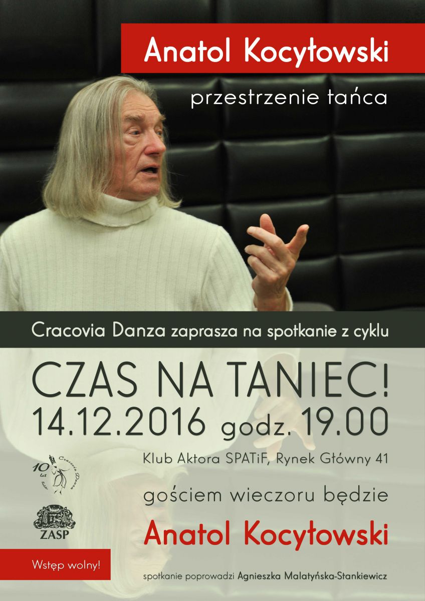 Tym razem gociem specjalnym spotkania CZAS NA TANIEC! będzie Anatol Kocyłowski - autorytet z dziedziny polskich tańców narodowych, tancerz, pedagog, choreograf i twórca scenariuszy widowisk, wielokrotny laureat nagród, w tym ostatnio Nagrody Kolberga, juror krajowych i międzynarodowych festiwali folklorystycznych, od 1980 kierownik artystyczny i choreograf Zespołu Pieni i Tańca Nowa Huta w Krakowie, który działa przy Nowohuckim Centrum Kultury. Spotkanie organizowane przez Balet Dworski Cracovia Danza otrzymało tytuł Przestrzenie tańca i odbędzie się w rodę, 14 grudnia o godz. 19 w SPATiF-ie, Rynek Główny 41, wejcie przez restaurację LOŻA.