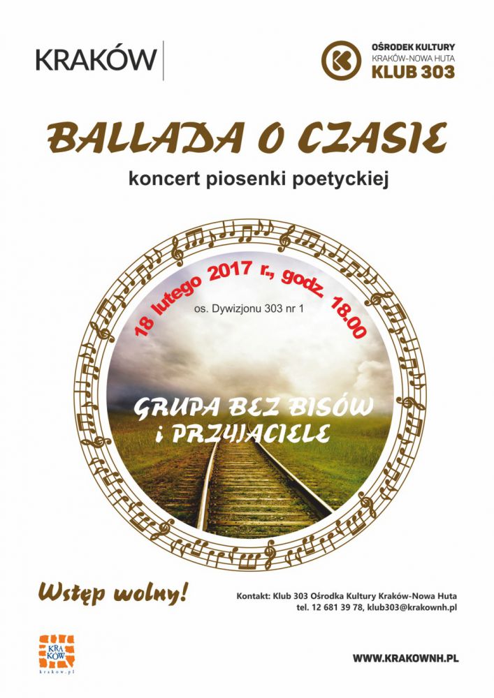 Jeżeli jeste wielbicielem muzyki z nurtu Krainy Łagodnoci, lubisz słuchać lub piewać piosenki Starego Dobrego Małżeństwa, Wolnej Grupy Bukowina czy grupy Bez Jacka, nie może Cię zabraknšć 18 lutego o godz. 18.00 w Klubie 303 Orodka Kultury Kraków-Nowa Huta (os. Dywizjonu 303 nr 1) na koncercie Grupy Bez Bisów. Zespół przygotuje na ten wieczór nastrojowe, poetyckie piosenki wymienionych wyżej autorów. Dla publicznoci zostanie przygotowana prezentacja z tekstami, dzięki czemu będzie mogła wspólnie z zespołem zapiewać znane i lubiane utwory. Warto przyjć do Klubu 303 i spotkać się z osobami, którym bliskie sš podobne klimaty muzyczne.
