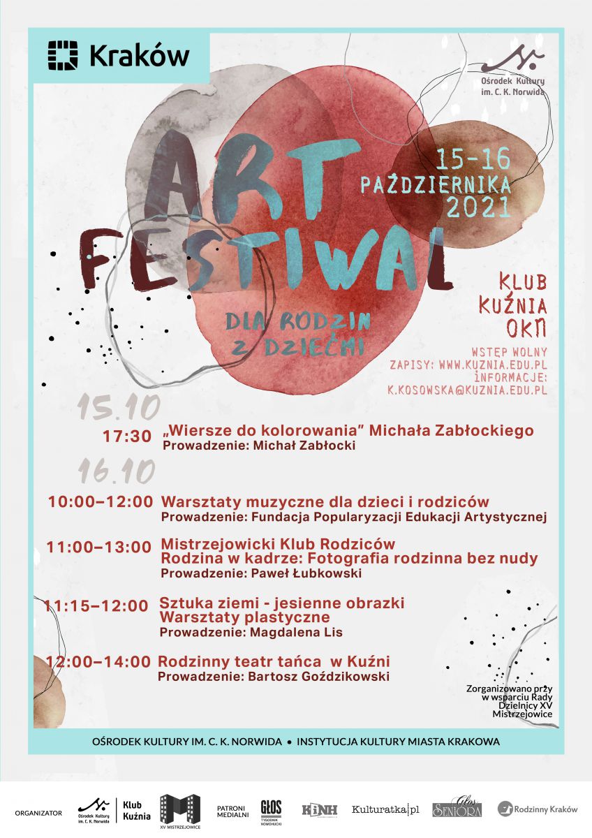 Art festiwal dla rodzin z dziećmi, czyli czas artystycznych dowiadczeń i odkryć adresowany do najmłodszych, ich rodziców i opiekunów. Zapraszamy 15 i 16 padziernika do Klubu Kunia na cykl warsztatów artystycznych. W programie: warsztaty literackie Michała Zabłockiego, tworzenie instrumentów muzycznych, sztuka ziemi, rodzinny teatr tańca i warsztaty fotograficzne.