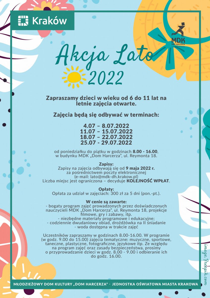 Zapisy na zajęcia odbywają się od 9 maja 2022 r. za pośrednictwem poczty elektronicznej (e-mail: lato@mdk-dh.krakow.pl) Liczba miejsc jest ograniczona – decyduje kolejność. zapisów potwierdzona dokonaniem wpłaty. Opłaty: Opłata za udział w zajęciach: 300 zł za 5 dni (poniedziałek do piątek).