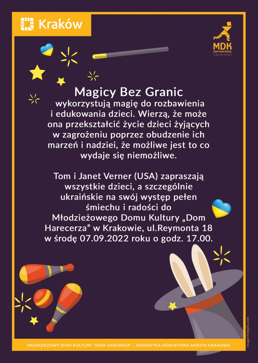 Tom i Janet Verner (USA) zapraszają wszystkie dzieci, a szczególnie dzieci ukraińskie na swój występ pełen śmiechu i radości do Młodzieżowego Domu Kultury „Dom Harcerza” w Krakowie, ul. Reymonta 18 w środę 7.09.2022 o godz.17.00