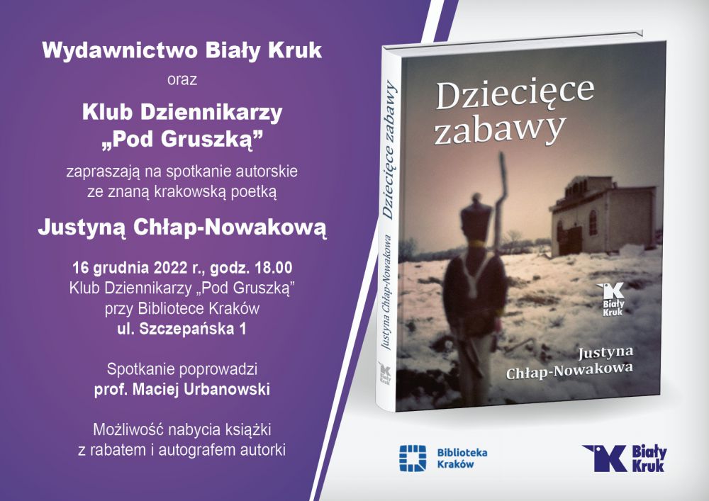 Spotkanie z autorką najnowszego tomiku wierszy pt. „Dziecięce zabawy”, który ukazał się nakładem Wydawnictwa Biały Kruk, odbędzie się 16 grudnia 2022 r. (piątek) o godzinie 18.00 przy Bibliotece Kraków, ul. Szczepańska 1.