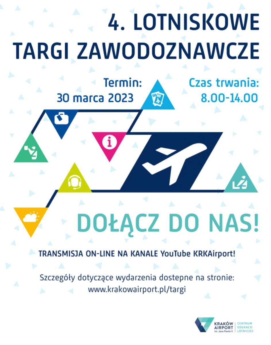 i jakie kwalifikacje należy posiadać, aby zdobyć wymarzoną pracę w branży lotniczej będzie się można dowiedzieć już niebawem podczas 4. Lotniskowych Targów Zawodoznawczych, organizowanych przez Centrum Edukacji Lotniczej Kraków Airport. Transmisja na żywo dostępna będzie 30 marca, w godz. 8:00-14:20, na kanale YouTube KRKAirport oraz na Facebooku Centrum Edukacji Lotniczej Kraków Airport. Podczas relacji na żywo w jednym miejscu będzie można spotkać przedstawicieli blisko 40 służb lotniskowych, a będą to m.in. Dyżurny Operacyjny Portu Lotniczego, Koordynator Ruchu Lotniczego Naziemnego czy przedstawiciel Lotniskowej Bazy Meteorologicznej.