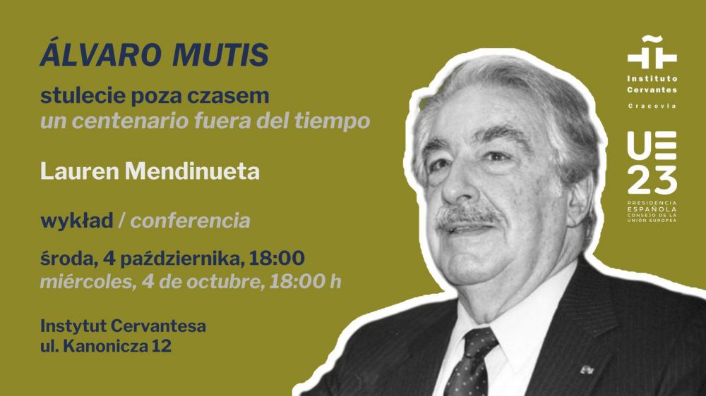 Z okazji setnej rocznicy urodzin kolumbijskiego laureata Nagrody Cervantesa, Álvaro Mutisa (1923-2013), Instytut Cervantesa w Krakowie pragnie oddać hołd temu wyjątkowemu pisarzowi, podróżnikowi, powieściopisarzowi dla zabawy, a przede wszystkim - poecie. Miłośnik życia i sybaryta, urodził się w Bogocie, a mieszkał i zmarł w Meksyku. W trakcie swojej kariery literackiej otrzymał między innymi meksykańską Nagrodę Xaviera Villaurrutii (1988), hiszpańską Nagrodę Literacką Księcia Asturii (1997) i Nagrodę Królowej Zofii w dziedzinie Poezji Iberoamerykańskiej (1997), Nagrodę Cervantesa (2001) oraz Międzynarodową Nagrodę Literacką Neustadt (2002).