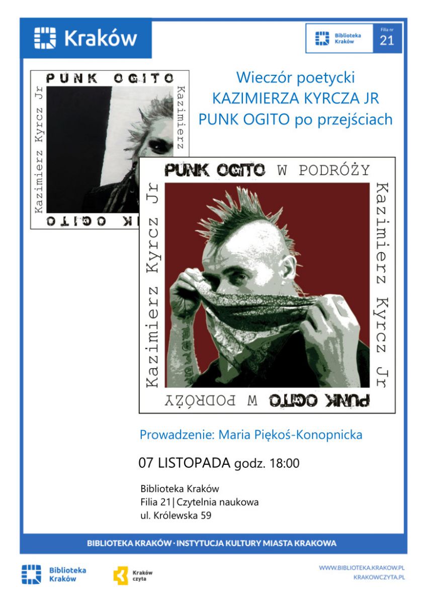 Spotkanie autorskie i promocja nowego tomiku poetyckiego Kazimierza Kyrcza Jr. Autor jest policjantem i pisarzem kryminałów, fantastyki oraz horroru, poetą i recenzentem. Punktem wyjścia dla tego zbioru jest najsłynniejsza persona liryczna wierszy Zbigniewa Herberta. Prowadzenie spotkania: Maria Piękoś-Konopnicka.
