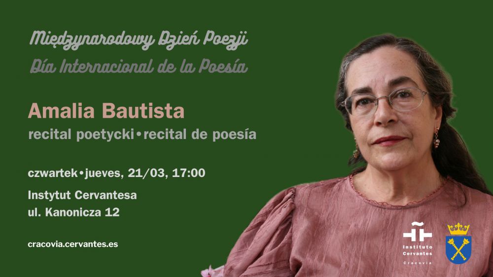 Z okazji  Światowego Dnia Poezji obchodzonego 21 marca Instytut Cervantesa w Krakowie serdecznie zaprasza na spotkanie z  hiszpańską poetką Amalią Bautistą połączone z dwujęzycznym, hiszpański-polskim, czytaniem wierszy z jej najnowszego zbioru, „Azul el agua” (2022).