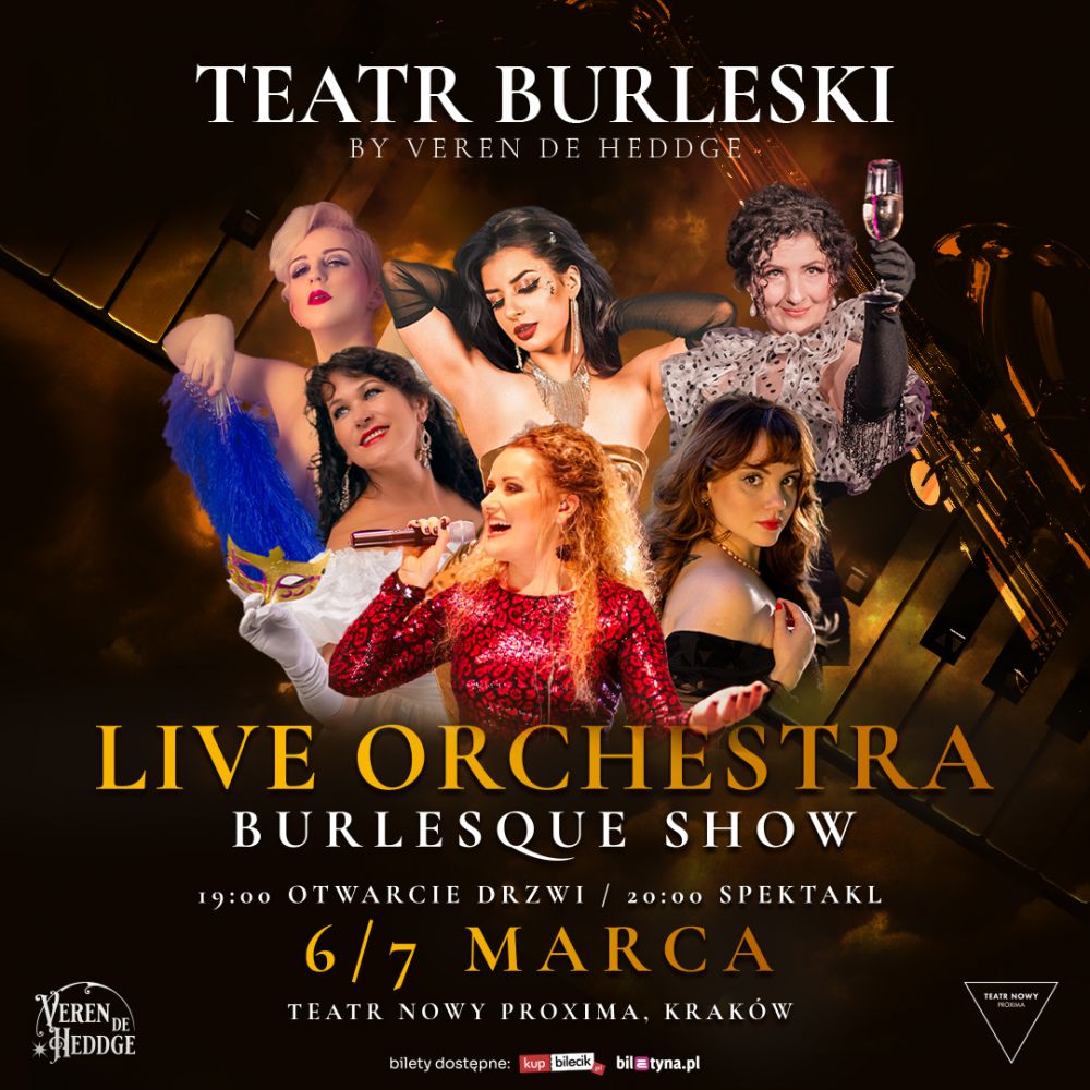 Zanurz się w magicznym świecie Burleski z muzyką na żywo! Teatr Burleski by Veren De Heddge wkracza na deski Teatru Nowego Proxima z wyjątkowym wydarzeniem. Po raz pierwszy w historii naszego teatru, już 6 i 7 marca o godzinie 20:00 będziecie mieli Państwo okazję doświadczyć magii burleski w połączeniu z muzyką na żywo!