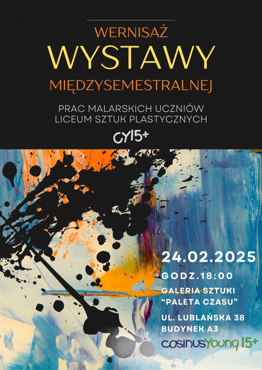 Uroczyste otwarcie Wystawy Międzysemestralnej odbędzie się 24 lutego 2025 roku o godz. 18.00 w Galerii Sztuki „Paleta Czasu”, w siedzibie Liceum Sztuk Plastycznych CosinusYoung15+ przy ul. Lublańskiej 38, budynek A3.