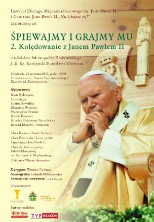 który odbędzie się w Filharmonii Krakowskiej 23 stycznia 2011 r. o godzinie 19. Koncert uœwietni swojš obecnoœciš ks. kard. Stanisław Dziwisz. Kolędy i pastorałki zaœpiewajš: Beata Rybotycka, Lidia Jazgar, Jolanta Kowalska, Zbigniew Wodecki, Przemysław Branny, a z Bukowiny Tatrzańskiej przybędzie nasz góralski goœć - Bartek Koszarek. Całoœć poprowadzi Lidia Jazgar, która jest także autorkš scenariusza i reżyserem koncertu. Artystom towarzyszyć będš chóry: Kantorei Sankt Barbara, Chór Psalmodia Uniwersytetu Papieskiego Jana Pawła II oraz Chór Archidiecezjalnej Szkoły Muzycznej im. Ks. Kard. F. Macharskiego, a także Orkiestra L'Estate Armonico. Orkiestrę i chóry poprowadzi Wiesław Delimat. Koncert jest nawišzaniem do starego zwyczaju kolędowania, które było obecne także w Watykanie podczas Pontyfikatu Jana Pawła II. Kolędowanie oznacza, że publicznoœć będzie mogła œpiewać znane wszystkim kolędy razem z artystami.