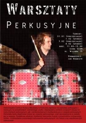Staromiejskie Centrum Kultury Młodzieży w Krakowie zaprasza na warsztaty perkusyjne z naukš gry na przedmiotach codziennego użytku. Zapraszamy zarówno uczšcych się gry na instrumentach perkusyjnych, jak i zainteresowanych możliwociš gry w zespole perkusyjnym. Warsztaty będš obejmować pokaz gry zespołu perkusyjnego, oraz wprowadzenie w zasady gry w zespole. Dodatkowe atrakcje: możliwoć tworzenia muzyki z przedmiotów codziennego użytku, multimedialne prezentacje instrumentów perkusyjnych, ich historii oraz współczesnych zastosowań.
