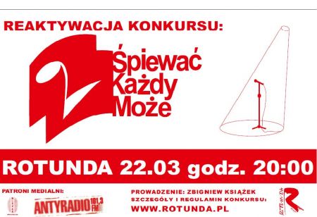 Na scenę Rotundy wraca kultowy już piewać Każdy Może-jeden z najstarszych i najbardziej cenionych krakowskich konkursów piosenki. Jednoczenie jest to najbardziej nieprzewidywalna i zaskakujšca impreza kulturalna, której fenomenu nie potrafi wyjanić nawet prowadzšcy - Zbigniew Ksišżek. W jaki więc sposób powstaje magiczna aura Konkursu piewać Każdy Może? Najważniejszy jest talent, którego już od pierwszych edycji nie brakuje. To tutaj bowiem rodziły się takie gwiazdy jak Grzegorz Turnau, Renata Przemyk czy Grzegorz Halama. Potrzebna jest także szczypta inspiracji, dzięki której młodzi artyci poszukujš nowych muzycznych trendów i przygotowujš autorskie projekty. Nie obejdzie się również bez potężnej dawki profesjonalizmu w postaci jurorów o niekwestionowanym autorytecie muzycznych, wród których znalazły się takie osobistoci jak: Lidia Jazgar, Marek Stryszowski, Antoni Krupa, Marek Michalak oraz Leszek Wójtowicz. Całoć zamyka wcišż kultywowana tradycja wspólnej nauki i wymienitej zabawy! To wszystko decyduje o niepowtarzalnym klimacie i niesłabnšcej popularnoci konkursu. Przerwa w kolejnych edycjach doprowadziła do prawdziwej kumulacji nieodkrytych talentów, a rozemocjonowana publicznoć z niecierpliwociš czeka na reaktywację konkursu.W zwišzku z tym serdecznie zapraszamy na prawdziwš eksplozję muzyczno-wokalnych wrażeń!