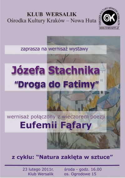Zapraszamy na wernisa wystawy Jzefa Stachnika Droga do Fatimy z cyklu Natura w sztuce zaklta. Otwarciu wystawy towarzyszy bdzie wieczr poezji Eufemii Ffary.