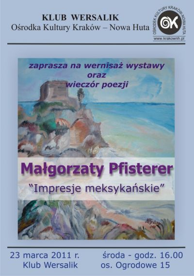 Zapraszamy na wernisa wystawy i wieczr poezji Magorzaty Pfisterer, ktry odbdzie si w Klubie Wersalik Orodka Kultury Krakw-Nowa Huta. Magorzaty Pfisterer - pedagog, artystka malarka, rodowita krakowiank. Swoje prace, wykonywane rnymi technikami, wystawia w Polsce i za granic. Cz z nich znajduje si w zbiorach prywatnych w Austrii, Ameryce, Afryce, we Woszech, a nawet w Indonezji. Uczestniczy w licznych plenerach i warsztatach, tak krajowych, jak i zagranicznych.