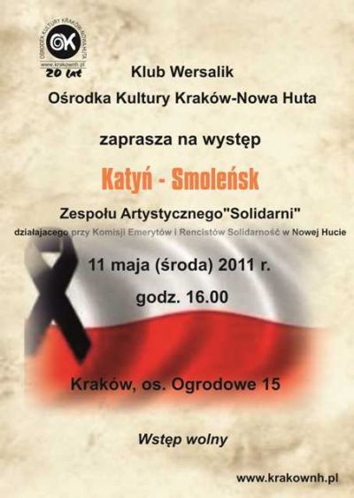 Program słowno - muzyczny w wykonaniu Zespołu Artystycznego ”Solidarni” działajšcego przy Komisji Emerytów i Rencistów Solidarnoœć w Nowej Hucie, upamiętniajšcy tragedie w Katyniu i Smoleńsku.