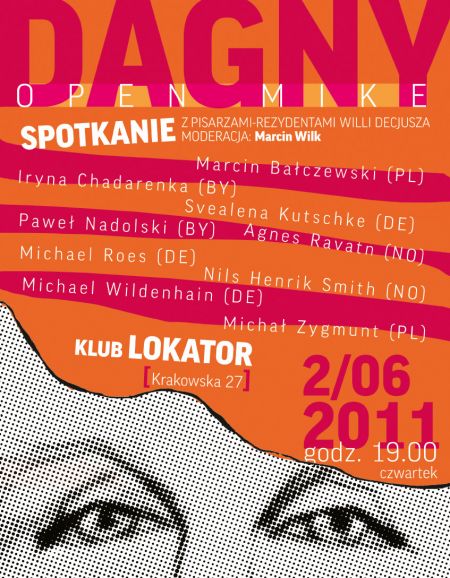 Stowarzyszenie Willa Decjusza zaprasza na kolejny wieczór literacki z cyklu DAGNY OPEN MIKE, który powięcony będzie prezentacji twórczoci pisarzy aktualnych rezydentów Willi Decjusza w ramach programu Dagny. W spotkaniu w Lokatorze udział wezmš: Marcin Bałczewski, Iryna Chadarenka, Paweł Nadolski, Agnes Ravatn, Michael Roes, Nils Henrik Smith, Michael Wildenhain, Svealena Kutschke. Spotkanie poprowadzi Marcin Wilk. Wstęp wolny.