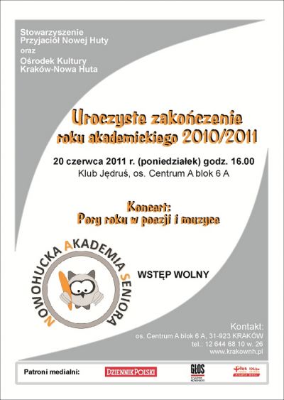 Nowohucka Akademia Seniora zaprasza Słuchaczy na uroczyste zakończenie roku akademickiego 2010/2011 r.