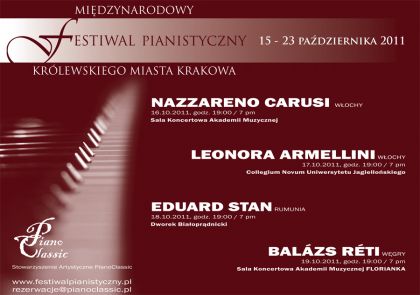 Podczas tegorocznej edycji III Międzynarodowego Festiwalu Pianistycznego Królewskiego Miasta Krakowa, który odbywać się będzie w dniach 16-19 padziernika usłyszymy wybitnych pianistów: Nazzareno Carusiego (Włochy), Eduarda Stana (Rumunia), Balázs Réti (Węgry). Na szczególnš uwagę w tym roku zasługuje występ włoskiej pianistki Leonory Armellini (Włochy), która w ubiegłym roku znalazła się w półfinale Konkursu Chopinowskiego