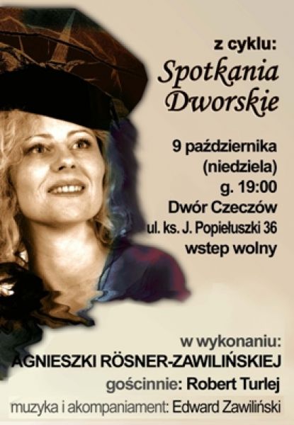 Od lirycznych kawałków po drapieżne melodie z paryskich scen. O tęsknocie, nadziei i miłoci zapiewa podczas "Spotkań Dworskich" Agnieszka Rösner-Zawilińska, artystka kabaretu Loch Camelot, laureatka III Ogólnopolskiego Festiwalu Piosenki Kabaretowej O.B.O.R.A. w Poznaniu, nagradzana wielokrotnie przez publicznoć. W repertuarze znajdš się aranżacje tekstów między innymi Bolesława Lemiana, Wisławy Szymborskiej, Juliana Tuwima, Adama Ziemianina i Edith Piaf.