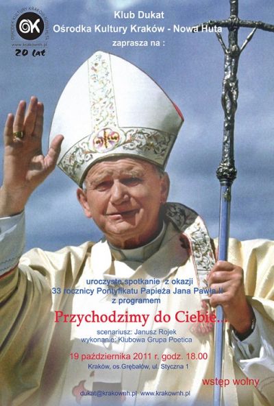 Klub Dukat Orodka Kultury Kraków-Nowa Huta (ul. Styczna 1) zaprasza 19 padziernika (roda) 2011 r. o godz. 18.00 na spotkanie Przychodzimy do Ciebie powięcone osobie Jana Pawła II.