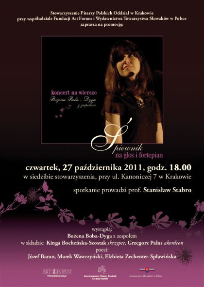 zapraszajš na spotkanie poetycko-muzyczne z okazji wydania piewnika na głos i fortepian do muzyki Bożeny Boba-Dyga pt. Koncert na wiersze