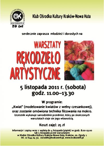 Serdecznie zapraszamy na sobotnie warsztaty rękodzieła do Klubu Orodka Kultury Kraków-Nowa Huta. W programie: Kwiat (modelowanie kwiatów z wełny czesankowej) oraz omówienie techniki filcowania na mokro. Uczestnik wykonuje samodzielnie przedmiot, który po zakończonych warsztatach staje się jego własnociš.