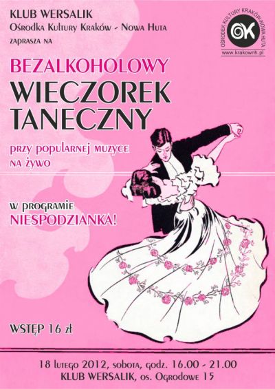 Klub Wersalik Orodka Kultury Krakw-Nowa Huta zaprasza na poegnanie karnawau podczas wieczorku tanecznego przy popularnej muzyce na ywo w wykonaniu zespou Mariana Soi. W programie niespodzianka.